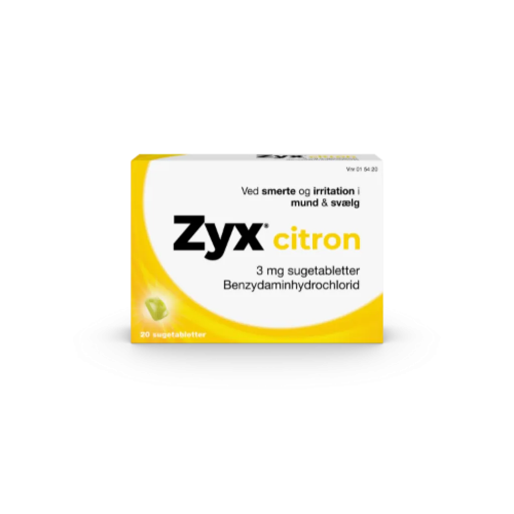 Zyx sugetabletter med smag af citron indeholder 3mg benzydaminhydrochlorid, som virker smertestillende, antiinflammatorisk og lokalbedøvende ved smerter i mund og svælg. Zyx er et lægemiddel som kan anvendes 3 gange dagligt i op til 7 dage.