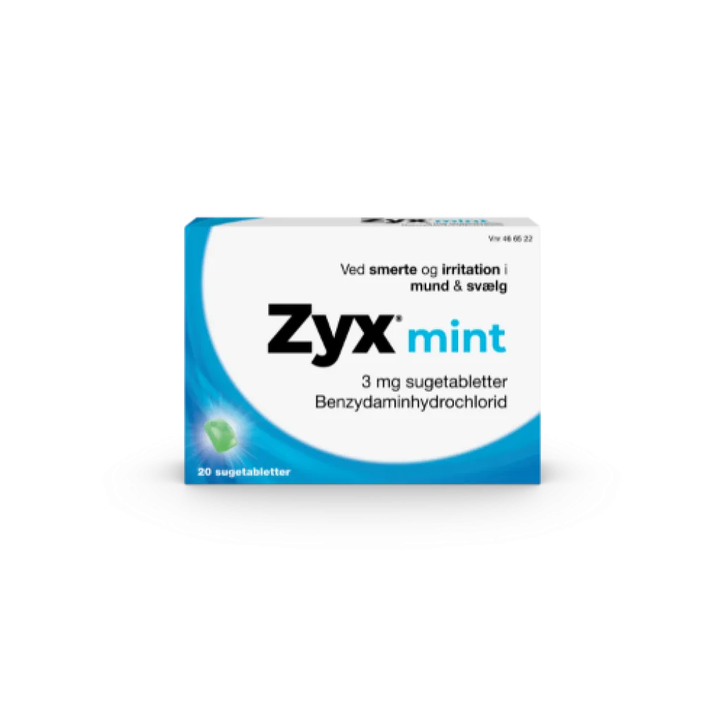 Zyx sugetabletter med smag af mint indeholder 3mg benzydaminhydrochlorid, som virker smertestillende, antiinflammatorisk og lokalbedøvende ved smerter i mund og svælg. Zyx er et lægemiddel som kan anvendes 3 gange dagligt i op til 7 dage.